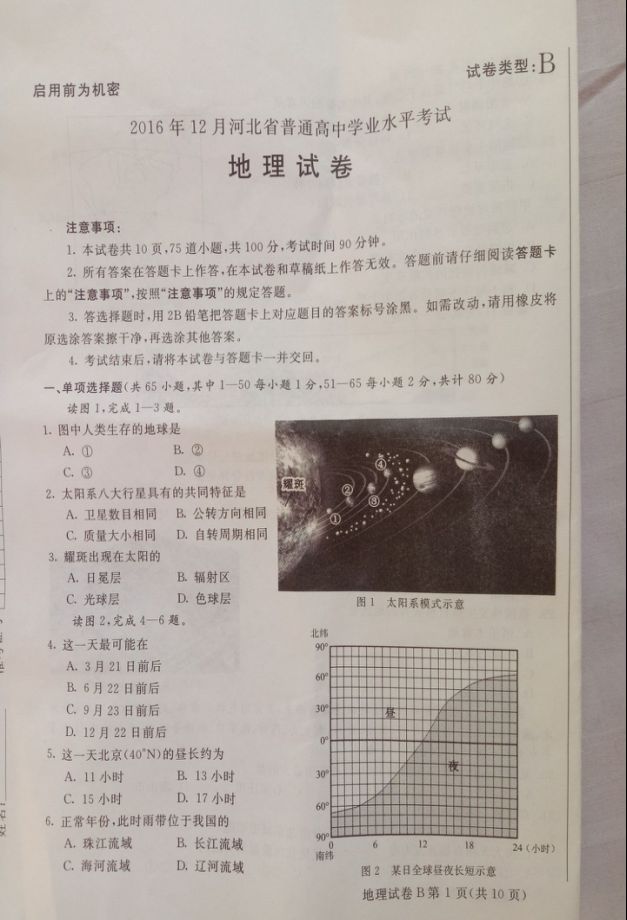 河北省2016年12月普通高中學(xué)業(yè)水平考試地理試題